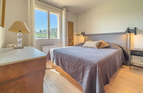 → A first bedroom with a QUEEN SIZE bed and a dresser for your belongings, offering breathtaking views of Saint Paul de Vence.