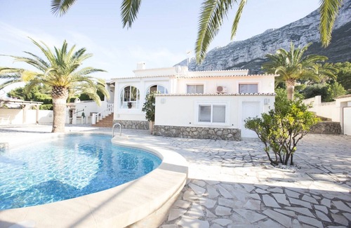 Lovely villa for rent, located in Montgo mount area, totally renovated and with beautiful sea views. Very quiet area. The villa comprises large covered and uncovered terraces with private pool and barbacoa.Built on two levels with separates entries. The main floor with living dining room, kitchen, 3 bedrooms, one bathroom with shower. The lower floor with one bedroom and one shower-room. Air conditionning in the living room and 2 bedrooms.