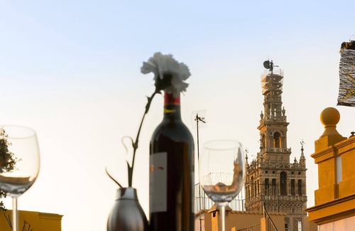 A glass door leads from the living area onto the terrace, complete with outdoor seating and decorated with plants. One side is shaded for the hot summer days and there are partial views of the Giralda tower.