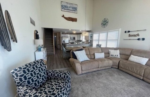 Begin New Memories in this 5 bedroom, 3 bath Townhouse one block from the Beach. 1st Floor offers 2 spacious bedrooms with a hall bath and laundry area 2nd floor offers a spacious living area with open concept, vaulted ceilings, fireplace in living room. Dining area with table that seats 8 and kitchen with counter top seating for 4. The Bedroom on this floor has a King bed and full bath. The third floor offers 2 more bedrooms with a shared full size bath. Off Street Parking is a concrete driveway for 2 cars and the back yard is fenced in with a gas grill and outside shower. This is a great neighborhood located in Restaurant row. Park your car and walk to fine eateries nearby. Steps to a guarded beach and promenade. Owner provides Beach Tags, Chairs and Cart (not guaranteed)