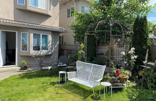 It is on the ground level has its owe private entrance directly through the garden. Located on a very quiet street close to a forest greenbelt with many walking trails around Renfrew Ravine Park.
