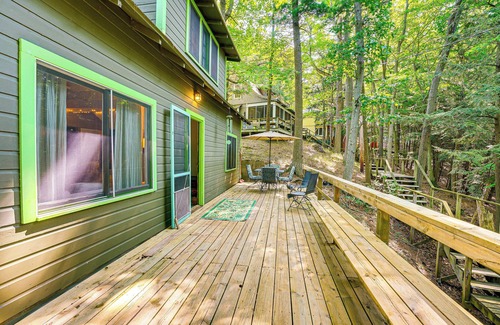 Inspired by the Michigan summers of a bygone era, this 5-bed, 1-bath vacation rental cabin teems with memories of well-spent vacations. Add yours to the mix amid vintage charms like exposed brick, delicate florals, and antique decor — all within 1 mile of Lake Michigan and Downtown Grand Haven. Walk to the beach, or drive to festivals, breweries, and museums. Back home, unwind on the deck surrounded by luscious greenery.
