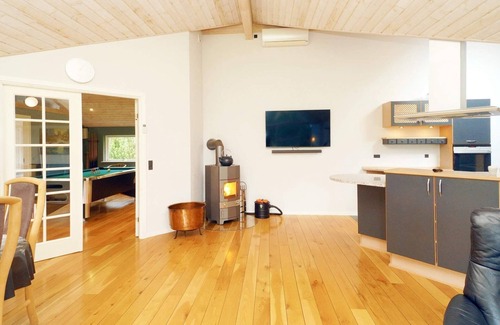 Layout: open kitchen(cooker(electric), hood, coffee machine, microwave, dishwasher, fridge-freezer, tumble dryer, washing machine), Living/bed room(TV(satellite, german television channels, danish TV channels (DR1 and TV2)), radio, CD player), bedroom(double bed), bedroom(double bed), bedroom(2x single bed), bedroom(2x single bed), bathroom(floor heating)(bathtub or shower, washbasin, toilet), bathroom(floor heating)(bathtub or shower, washbasin, toilet), mezzanine(2x single folding bed), sauna(4 persons), patio, heating(electric), terrace, terrace(roofed), BBQ, table tennis table, darts, football goal, billiards, air to air heatpump