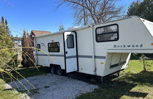 This open concept trailer suits a family of 4 or 2 adults for a cozy getaway (up to 2 additional people @ $40.00/ person. There is a raised double bed off the combination kitchen sitting area suitable for 2 and 2 single bunks near the bathroom . Settle in for your stay or enjoy a short drive to sandy beaches, rocky shores or The Bruce Trail.