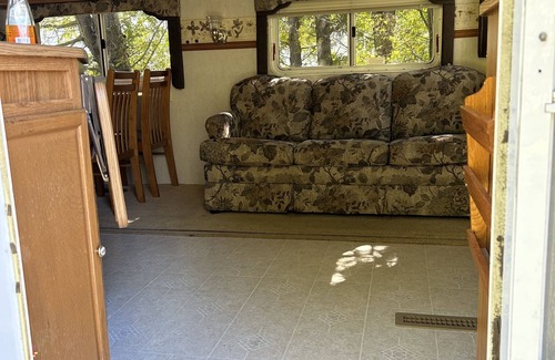 This cozy open concept Prowler trailer is equipped with a bedroom nook with a queen size bed . The spacious dining area for 4 and kitchen also has an electric fireplace for chilly nights. The sofa converts to additional sleeping space suitable for children or 1 extra adult. There is a trailer size shower and tub in a 3 piece bathroom.