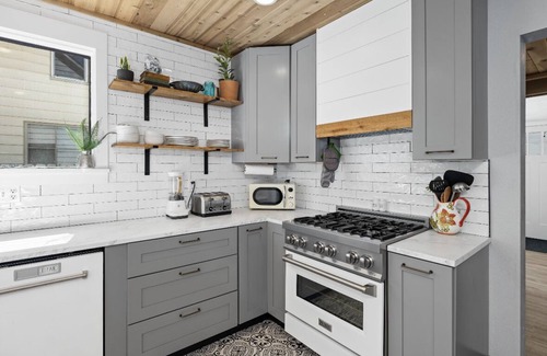 The kitchen is fully stocked and features a gas ZLINE stove and a CHILL brand icebox refrigerator. The laundry room is tucked behind the kitchen. There is a mud room just before heading through the back door to drop all the extra equipment that come with traveling.