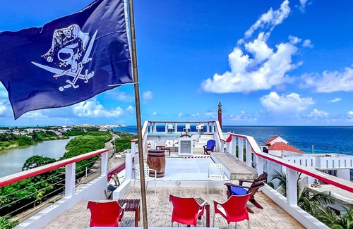 Step into a world of nautical charm where the Wheelhouse’s architecture pays homage to the sea. The stunning rooftop deck, adorned with a pirate flag, offers an unparalleled vantage point for soaking in the breathtaking Caribbean views. Relax in the open-air lounge, sip a cocktail as the sun sets, or stargaze under the island sky—the choice is yours.
