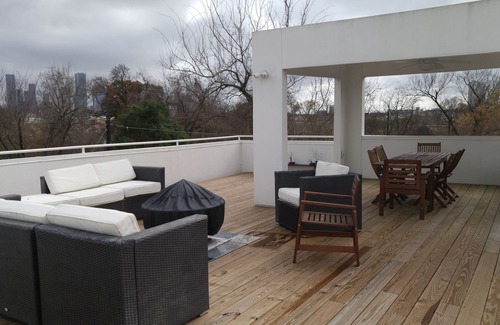 Treat yourself in this luxury 1st floor apartment in a new architectural modern home, close to everything in the trendy Washington St / Heights area. Located in a pristine patch of old growth woods, it is your own private retreat. Glass wall and private deck overlook woodlands and bayou. Bedroom with queen bed and walk-in closet. Queen sofa bed in living room. Kitchen includes dishwasher, gas stove/oven, refrigerator, microwave and pantry, and is stocked with essentials. 42” TV with local channels, numerous apps and Netflix. Free wi-fi and hard wired high speed internet. Access to huge roof deck available from spiral stair tower with fire pit and grill. Bikes and tennis equipment available to borrow. Washer and dryer in garage. Free parking in front of entrance.