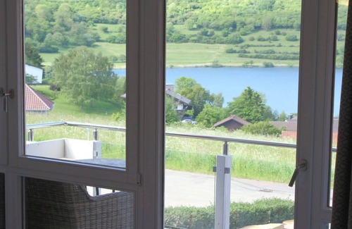 Apartment Seeidyll in the Maarberg Resort: Elegant, completely newly furnished apartment for 2 to 4 people. approx. 48 sqm living space, balcony direction lake and ornamental pond. The apartment Seeidyll is located in the middle floor, at ground level to the entrance and offers from the apartment and the balcony a magnificent view of the lake, the beautiful landscape and the well-kept pond. Sit in the apartment or on the balcony and be enchanted by the view. In the beautiful living room you will find a new sofa set with bed function and a large, 127 cm HD / 3D TV of the new generation. You have the choice of about 3,000 different TV and radio stations in many languages from 4 different satellites. There is also a 3D Blueray player and DVD player. Also a music system with radio, CD, etc. is located on the apartment. There is an internet access with WIFI (WiFi). The bright and friendly furnished apartment conveys a nature-related flair with lots of wood and stone. In addition, the electric fireplace and an elegant ceiling fan spreads a special, cozy atmosphere. So you get a special holiday atmosphere even on cold and wet days. It is a Non smoking apartment (smoker please use the balcony or outdoor area) The new fitted kitchen has a 4 ring hob (ceramic hob) and oven, dishwasher, fridge freezer, microwave, 2 coffee machines (filter and pad machine, Bosch Tassimo). Toaster, kettle etc. Pots and pans as well as cutlery and crockery for the highest possible number of people are of course available. A cot and high chair can be provided free of charge. The dining area is suitable for 4 persons. The apartment has a separate bedroom with a high-quality box spring bed (180 cm x 200 cm). So nothing stands in the way of a good night's sleep. You will find in the bedroom large full length mirror. The living room has a new double sofa bed as additional sleeping space. Pamper yourself in the steam shower with light therapy, massage jets for body and feet, rain shower and many other functions. Also a radio is integrated. The throughout the bathroom, blue luminous floor LEDs provide a great atmosphere. A large, illuminated mirror, a hotel hair dryer and a personal scale are available. Modern heating with towel warmer. The apartment has a nice balcony with 4 lounge chairs and a cocktail or Coffee table. If you want to eat good food on the balcony, you will find another dining table as a folding table to take away on each floor. The apartment has central heating and of course a separate entrance.