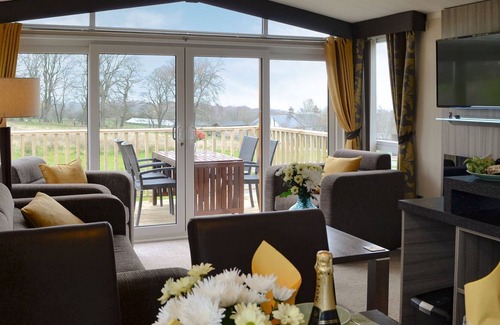 Surrounded by farmland and with its own private hot tub, this delightful lodge is ideal whatever the time of year.. Ground Floor: