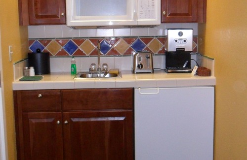 Enjoy the convenience of a kitchen equipped with a refrigerator, microwave, and coffee maker among many other modern appliances. Additional in-room amenities include a flat-screen TV, cable, VCR/DVD player, internet, iron/ironing board, heating, and air conditioning. Other amenities provided for guests include an Alarm Clock, Safe, Hairdryer, Telephone and Voicemail, Dining Room Table, Complimentary Wi-Fi, Blender, Toaster, Stovetop, Dishes & Cutlery.