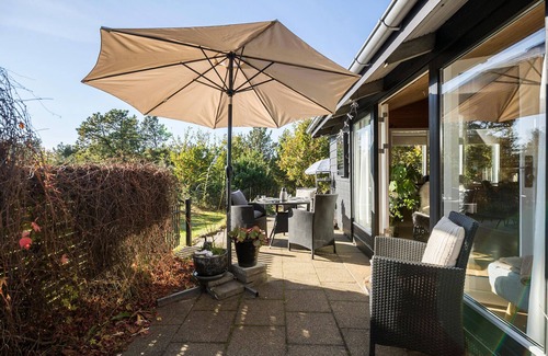 Your holiday home in Trend on the picturesque Bjørnsholm Bay offers you peaceful surroundings and the ideal retreat for a relaxing stay. Start your day with breakfast on the sunny terrace, which is equipped with comfortable seating and a large parasol. Let your gaze wander over the green garden with its many shady trees and enjoy the tranquillity of nature. The terrace also invites you to socialise in the evening, ideal for al fresco dining.
