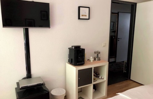 An approx. 16 sqm room with king-size double bed (180x200) and an approx. 13 sqm room with single bed (80x200). A small fridge with drinks, breakfast snack, a Senseo coffee maker and a kettle are at guests' disposal. Please note that not often but sometimes a dog stays with me. But only in my room.