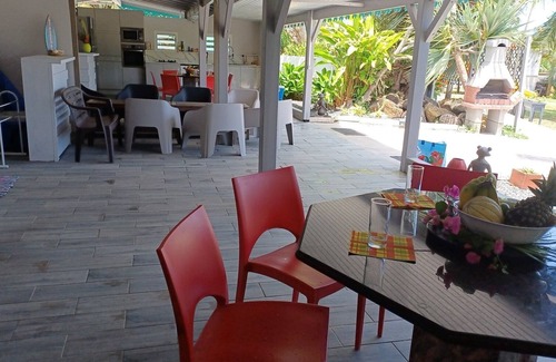 Apartment on the ground floor in a large colonial type house which offers several apartments (see my other ads). The 32 m2 apartment is made up of 1 living room with TV, 2 air-conditioned bedrooms 2 shower rooms with walk-in shower, 2 toilets, 1 equipped kitchen with washing machine opening onto the 24 m2 covered terrace, in front of the tropical garden and swimming pool.