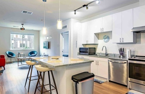People love the modern and stylish decor and the thoughtful touches that welcome you to our apartment. Our guests love to gather and lounge within the living room area as the open floor plan allows for great conversation and hosting.