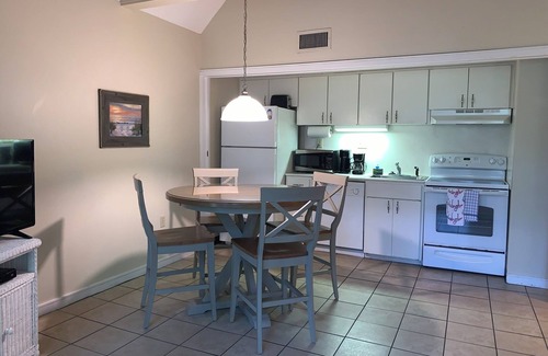 This one bedroom second floor villa offers a cathedral ceiling in the main room. It includes a screened in porch overlooking a private lagoon. The villa sleeps four people with a King size bed and a sleeper sofa. The sleeper sofa is best suited for children. The bathroom was recently renovated and has a walk in shower. The villa offers a fully equipped kitchen.