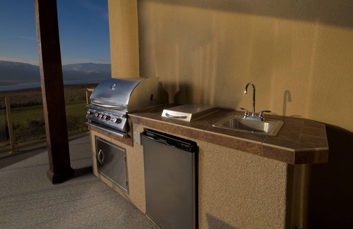 Large gourmet kitchens include premium appliances, and sun tunnel skylights. The outdoor kitchen includes large, gas fired grill and counter with small fridge.