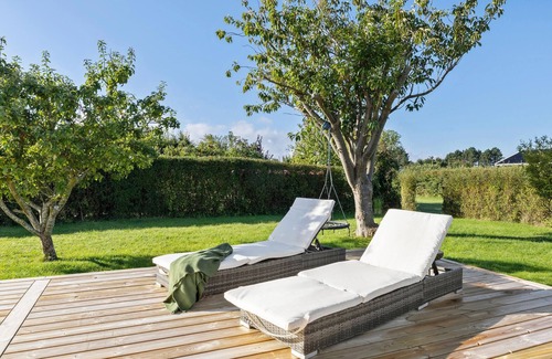 The spacious wooden terrace is perfect for everyone to enjoy, and the extensive lawn offers plenty of space to play and romp around. As the day draws to a close, the fire pit becomes a meeting place for the whole family, where you can make stick bread and enjoy cosy conversations under the evening sky.