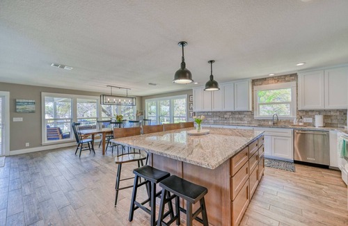 The home has 2 master bedrooms, 2 queen bedrooms, and a bunkroom. There is a large kitchen open to the dining space and family room - all overlooking Lake LBJ! There is a game room with competition-size shuffleboard table, pool table, and lots of smart TVs to keep up on the latest sporting events or access your favorite streaming services.