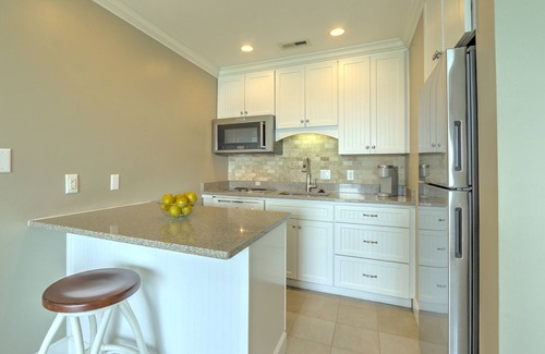 If it's the ocean you are looking for, there is no better view from the Breakers than this unit We now have elevators at the Breakers!. Because this villa is on the top floor the private balcony is open to the sky and offers privacy for sunbathing while gazing at the ocean and beach by day and for observing the moon and stars during the evenings. The Tybee Island light house can be seen in the distance. You can watch the dolphins playing in the surf while listening to the waves lapping the shore from your balcony. All of this can also be enjoyed from the living room and kitchen because of the direct ocean view. The kitchen has been enlarged and ceiling height cabinets added with quartz countertops, new fixtures and appliances have been installed. Also dimmable recessed lighting and a 46 inch flatscreen TV has been installed in the living room along with a 32' flatscreen on the wall in the enlarged bedroom. The entire villa has Charleston style furniture and decor throughout.
