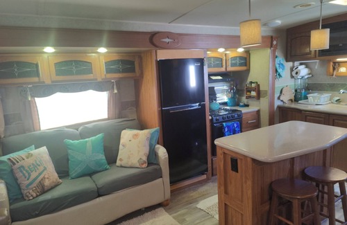 35 ft RV, large deck, intercoastal sunset, campground across street from ocean is located in North Topsail Beach. 35 ft RV, large deck, intercoastal sunset, campground across street from ocean provides accommodation, featuring Security/Safety, Child Friendly, Kitchen, among other amenities. This House features Security/Safety, Child Friendly, Kitchen, to make your stay a comfortable one.