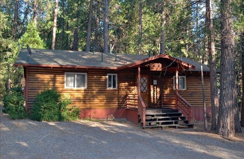 River Song is a 2 bedroom, 2 bathroom cabin that sleeps up to 6 guests. This home sits in an ideal location, only yards from the "wild & scenic" south fork of the Merced River, swimming holes, fishing, and hiking. The large, private deck has a gas BBQ, picnic table, and lounge chairs and overlooks a glen with a seasonal babbling brook, making it a great place to enjoy grazing deer, wildlife, birds, and wildflowers. Amenities include central air conditioning & heating (separate controls), a well-equipped kitchen with a dishwasher, satellite TV, WiFi, and a cozy atmosphere with an extensive library. Kids love the bunk beds. Just a short walk to a laundry facility, Event Center, and lobby/concierge. No pets allowed. "EV Charging Station available within five miles of the cabin"