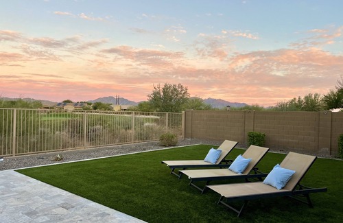 The perfect vacation home awaits you in this well-appointed ranch style home! You'll enjoy four bedrooms, including a second suite with attached living space and separate entrance. The clean, open eat-in kitchen highlighted by a large dining table, and additional seating for four at the kitchen island. Relax and kick back on the covered patio featuring a ceiling fan, patio misters, comfortable sectional seating and gas fire table while watching the golfers enjoying their round. Take a dip in the private, heated pool that sports a tranquil water feature and LED lighting, or unwind in the attached spa after a day of hiking or mountain biking on the nearby trails. Wireless internet access is available, as well as streaming tv. Whether you are looking for a quiet space to relax and unwind, catch Spring Training baseball, or play a round of golf, this home is perfectly located to enjoy all those activities and more! Located about 35 minutes from Sky Harbor International Airport and easy access to Scottsdale from the nearby I-10. Spring Training for the Cleveland Guardians/Cincinnati Reds is a quick 15 minute drive down the hill, and the PHX Raceway is even closer.