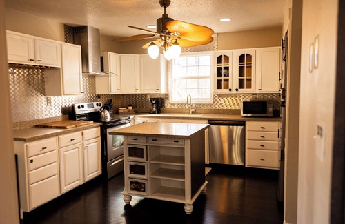 The kitchen features all major appliances with beautiful granite countertops for you to prepare any meals you wish! All cookware, drink ware, and dinnerware are provided (aside from very large pots/pans for crowds) along with plenty of storage.