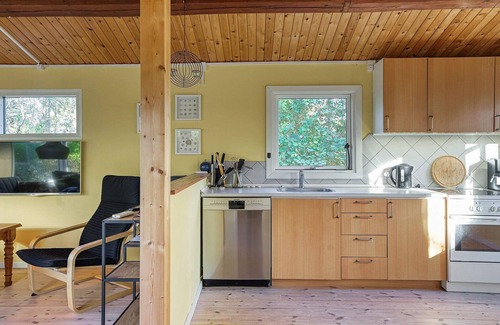 Layout: Kitchen(cooker(electric), coffee machine, dishwasher, fridge(+ freezer)), Living/bed room(double folding bed, TV(german television channels, danish TV channels (DR1 and TV2)), high chair), bedroom(double bed), bathroom(washbasin, shower, toilet), heating(electric), terrace, garden, garden furniture, air to air heatpump