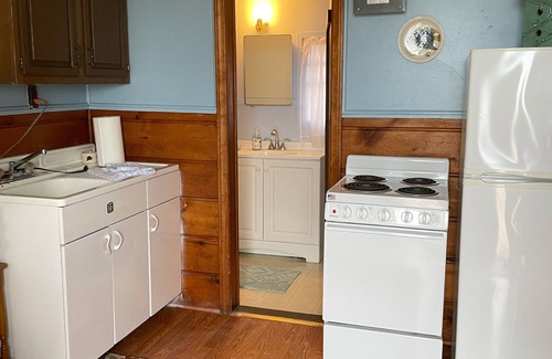 Studio Type Cabin with kitchenette right on the beach! Beautiful Lake Huron views with private grill and picnic table shared firepit and sandy bottom lakeshore. Sofa, refrigerator/freezer, stove, microwave, sink, coffee maker and toaster make staying in as much fun as going out. Unit is number 4 of 6 in a six unit resort. One bedroom, one bath studio kitchenette right on the beach, sunrise view from bed! This unit has one large bedroom with one bed in it. The couch is also in the same room that can pull out into a full size bed to accommodate two more to sleep but it is a tight squeeze. The kitchen is connected without a door as seen in the pictures. This unit is perfect for a couple or a small family and has everything you need for a weekend getaway or fun family vacation. Leave your cares at home and lull yourselves to sleep while listening to the crash of the Lake Huron waves from your bed in this charming rustic adorable room right on the beach! Not recommended for four adults, sleeps 3 comfortably.