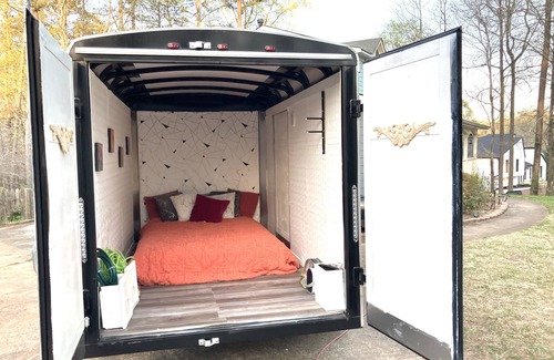 450- A LAKE VIEW with Showers, bathrooms, electric/water, stove burners, microwave, mini fridge and bed with linens other toiletries, wifi. For 450 per month rental unit. Month to month in Atlanta area. Custom made by designer.