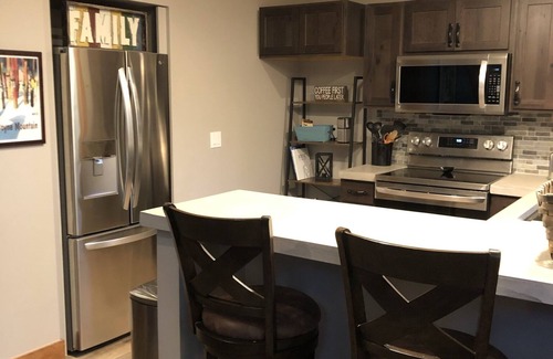We've created a cozy, comfortable, fun place that we love going to. It doesn't even matter if we ski or just kick up our feet and relax, it's our home away from home. Other condos say "SKI IN/SKI OUT" but we really mean it. You don't have to cross a road, you just walk out the back door and you're on the run! You can ski down to get your passes for the day, stop in at your own condo for breaks, snacks, a fire, etc. and then get back out! You save a ton of money by not having to eat out while skiing. And it's super clean. We have a great cleaning team that scrubs the entire place before each guest arrives. And we are smoke free/pet free to keep our place that way!