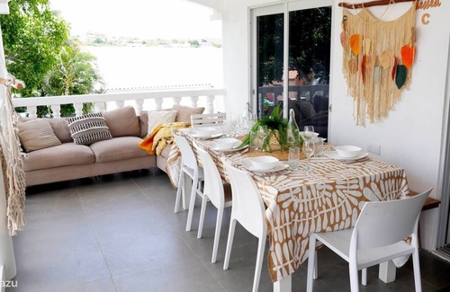 Agosto Accommodation is the largest and most luxurious unit at the MoreblessingsCuracao mini-resort. This ground-floor apartment, perfect for up to 7 people, features air conditioning and is easily accessible with no stairs. The back terrace overlooks the beautiful communal pool, lounge area, outdoor kitchen, and barbecue spot, ideal for relaxing and dining together.