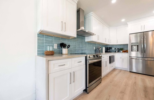 The fully equipped kitchen is a chef’s dream, featuring stainless steel appliances, a 5-burner induction stove, a dishwasher, and a microwave. A dedicated coffee bar includes both a drip coffee maker and a Keurig machine. The dining space comfortably seats eight guests, making it the perfect spot for shared meals and gatherings.