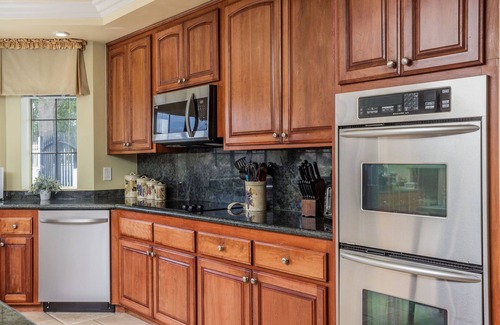 This elegant home is perfect for a family reunion, a corporate retreat, or a group-getaway. The first floor of the Main Home offers an oversized master suite complete with a California king bed, sitting area, and chandelier-lit spa tub in the master bath. Also, on the main floor is a queen bedroom with a private bath, as well as an extra bedroom with two twin beds that can be converted to a king upon request. The first-floor rooms can accommodate up to six guests.