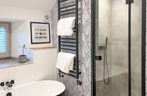 Bathroom: With bath, walk-in shower, toilet and heated towel rail.