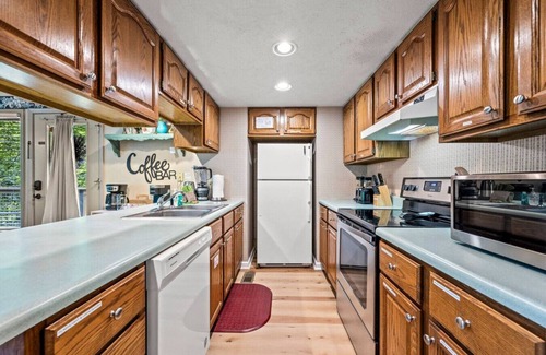 Fully-stocked kitchen with a full suite of appliances; There is a full sized refrigerator to hold your groceries or any leftovers from trips out on the town. Utilize the dishwasher for a quick clean up anytime. Includes pots, pans, glasses, plates, silverware, etc. Eat comfortably at the beautiful wood dining table just steps outside the kitchen with plenty of space for 6-8! There are 3 additional bar stools at the countertop bar for additional seating. You can also take your picnic outside and enjoy patio dining in the fresh mountain air!