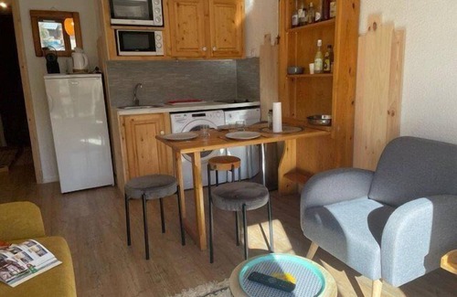 The residence Les Clarines is located in Risoul, 50 m from the ski slopes, next to the ski lift of L'Orée du Bois and 250 m from the ski school. The resort center and shops are situated 200 m from the residence. Surface area : about 25 m². 4th floor. Orientation : South-East. View ski slopes. Living room with bed-settee, TV. Cabin with 2 bunk beds. Kitchenette with oven / microwave, washing machine, dishwasher, mini-oven, vitroceramics cooking rings, fridge-freezer. Bathroom with bath-tub, WC. Balcony. The beds in elevation are not suitable for children under 6 years.