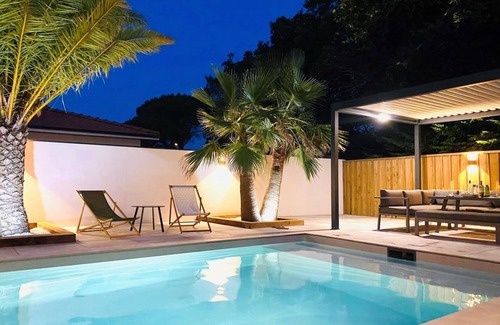 Do you fancy sun, ocean views, happy hours with friends, boat or bike rides? Come discover this cozy home that will delight families and friends alike, enjoying the Arcachon Bay, the Pyla Mountains, and the ocean beaches. You can explore the Dune and find plenty of ideas for walks along the coastal path. Located in Gujan-Mestras, in a quiet neighborhood close to all amenities, our house features a beautiful air-conditioned living room with an entrance hall, a fully equipped kitchen, a dining room, and a living room overlooking the terrace and pool. It also features three bedrooms, each with a queen-size bed (160x200cm), a mezzanine under the roof with a queen-size bed (140x190cm), two bathrooms, and a separate toilet. You'll have access to a private outdoor space with a terrace, a private pool, a pergola with outdoor furniture, a plancha grill, and a bowling alley. Private parking for two vehicles. Bed linens, towels, table linens, heating, and Wi-Fi are included in the price. End-of-stay cleaning is available (paid service upon request; a €150 cleaning deposit will be required upon arrival). Air conditioning is available in the living area only; the bedrooms are equipped with electric heating. The swimming pool is open from May to September, weather permitting.