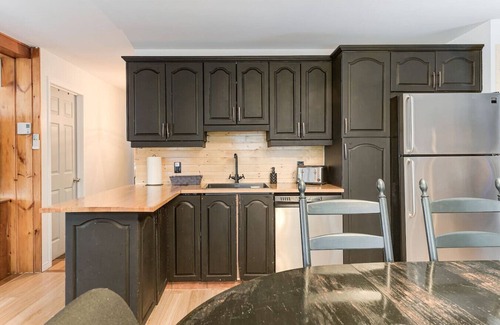 Make yourself comfortable and relax after a great day of skiing by the stone fireplace on the main floor (firewood not included). Enjoy our cozy living room with a smart TV, and the fully equipped open-concept kitchen that flows into the dining area.
