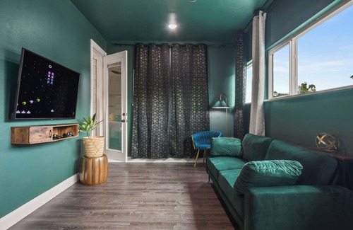 Our villa features a coal BBQ, summer kitchen, fire pit, outdoor dining area, corn hole game, board games, and a retro console. Feel free to bring your furry friend along: we have an enclosed backyard and a lovely park by the lake nearby.