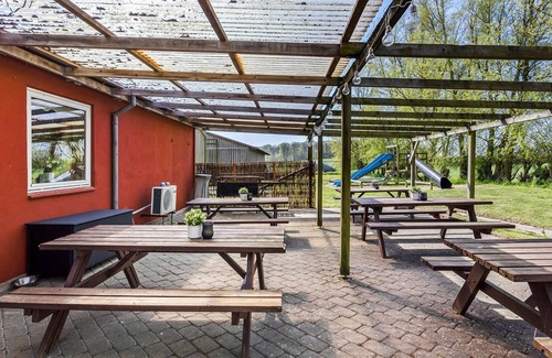 Spend relaxing hours in the sheltered courtyard with lounge furniture or take a seat at the long tables on the covered terrace. Enjoy the sun on the loungers or watch the children play in the spacious grounds with slide, trampoline and space for ball games. The large grounds are shared with the main house and offer sweeping views over fields, forest and as far as Langelandsbælt.