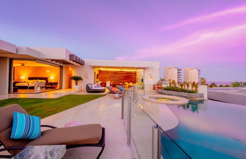 Contemporary home with six bedrooms and seven bathrooms plus a pool house in an exclusive gated beachfront enclave nestled between two 5-star resorts and overlooking the Sea of Cortez. The community, known as Blue Sea, is in the corridor between Cabo San Lucas and San Jose del Cabo. Restaurants and spa are steps away.