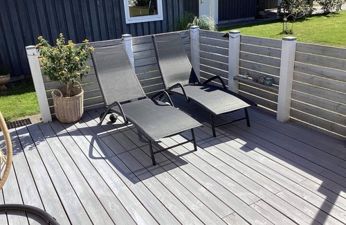Layout: Kitchen(stove(induction), coffee machine, dishwasher, fridge-freezer), Living/bed room(TV, chromecast), bedroom(double bed), bedroom(2x single bed), bedroom(2x single bed), bathroom(tumble dryer, washbasin, shower, toilet, washing machine), carport, heating(electric), garden furniture, sun loungers, air to air heatpump