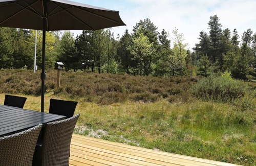 Layout: open kitchen(cooker(electric), hood, coffee machine, microwave, dishwasher, fridge-freezer), Living/bed room(TV(satellite, german television channels, danish TV channels (DR1 and TV2)), DVD player, radio), bedroom(double bed), bedroom(double bed), bedroom(double bed), bathroom(floor heating)(tumble dryer, bathtub or shower, washbasin, toilet, washing machine), bathroom(floor heating)(washbasin, toilet), sauna(6 persons), heating(electric), terrace, terrace(roofed), BBQ, play equipment, air to air heatpump