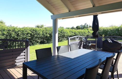 Layout: Kitchen(cooker(electric), coffee machine, microwave, dishwasher, fridge, fridge(+ freezer)), Living/bed room(TV(german television channels, danish TV channels (DR1 and TV2), norvegian TV channels , swedish TV channels), DVD player, CD player, children's bed, high chair), bedroom(double bed), bedroom(double bed), bedroom(2x bunk bed), bathroom(washbasin, toilet), bathroom(washbasin, shower, toilet, washing machine), Bubble bath(indoor, 2 persons), heating(electric), terrace, garden furniture, play equipment, air to air heatpump