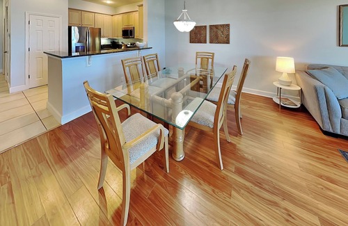 The fully equipped kitchen features major appliances, cookware, and everything you need for easy vacation meals. A glass-top dining table provides the perfect setting for casual dinners or evening games with friends and family.