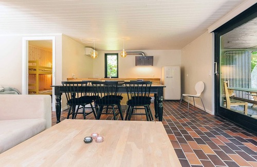Layout: Annex: (double bed) Kitchen(stove(induction), coffee machine, oven, dishwasher, fridge(+ freezer)), Living/bed room(TV, chromecast), bedroom(double bed), bedroom(single bed), bedroom(2x bunk bed), bathroom(washbasin, shower, toilet), heating(electric), terrace, garden furniture, air to air heatpump