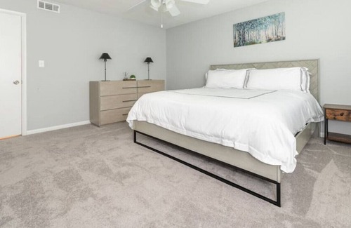 Fully upgraded and newly renovated townhouse. The kitchen has a microwave, dishwasher, coffee brew (coffee provided) and a toaster. The living room has a comfortable couch for you to relax and enjoy your favorite show on the Roku TV. There is a desk to catch up on your latest emails.