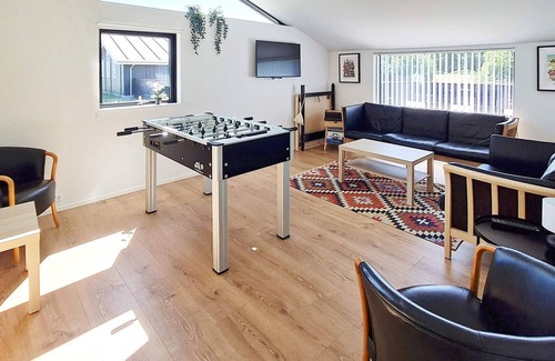 Layout: Kitchen(stove(induction), coffee machine, microwave, dishwasher, freezer(60-99L), fridge-freezer, high chair), Living/bed room(TV(german television channels, danish TV channels (DR1 and TV2), norvegian TV channels , swedish TV channels)), bedroom(double bed), bedroom(double bed), bedroom(4x bunk bed), bathroom(tumble dryer, washbasin, shower, toilet, washing machine), bathroom(washbasin, shower, toilet), heating(electric), terrace, garden furniture, sun loungers, BBQ, table football, air to air heatpump